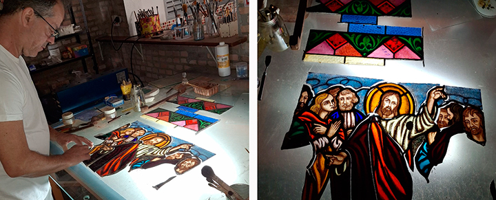 Após essa etapa, cada vitral é montado em seu formato original, recebendo novos perfís com liga de chumbo e estanho, são soldados, ficam estanques e consolidados.