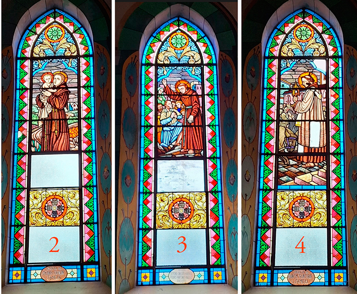 Primeira etapa do restauro: fixação de vitrais instáveis no local, restauro de 4 rosácias e restauro de um vitral com o tema do Convento da Penha, de Vitória. Criação de 3 vitrais faltantes, com temas de Aparecida, e dos locais onde viveu e pregou Santo Antônio de Pádua.